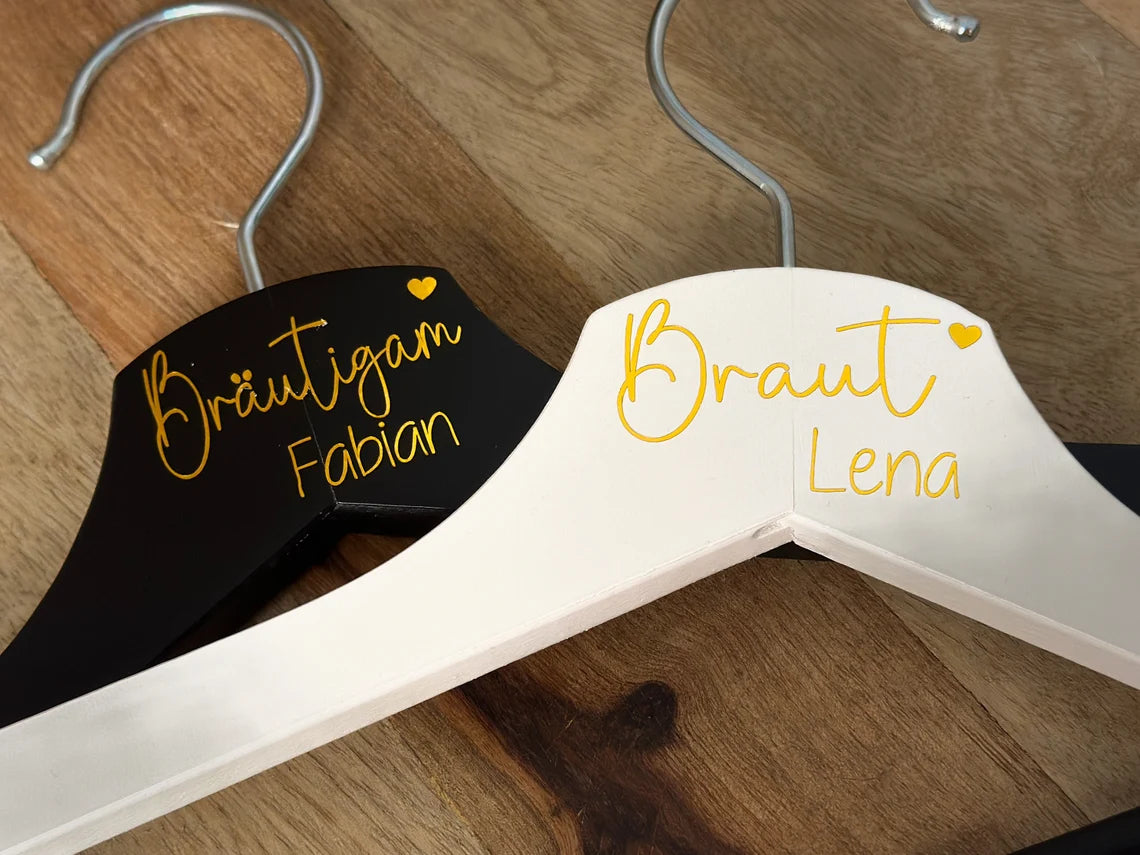 Unsere hochwertigen Holzbügel werden individuell nach deinen Wünschen beschriftet – stilvoll, elegant und einzigartig.