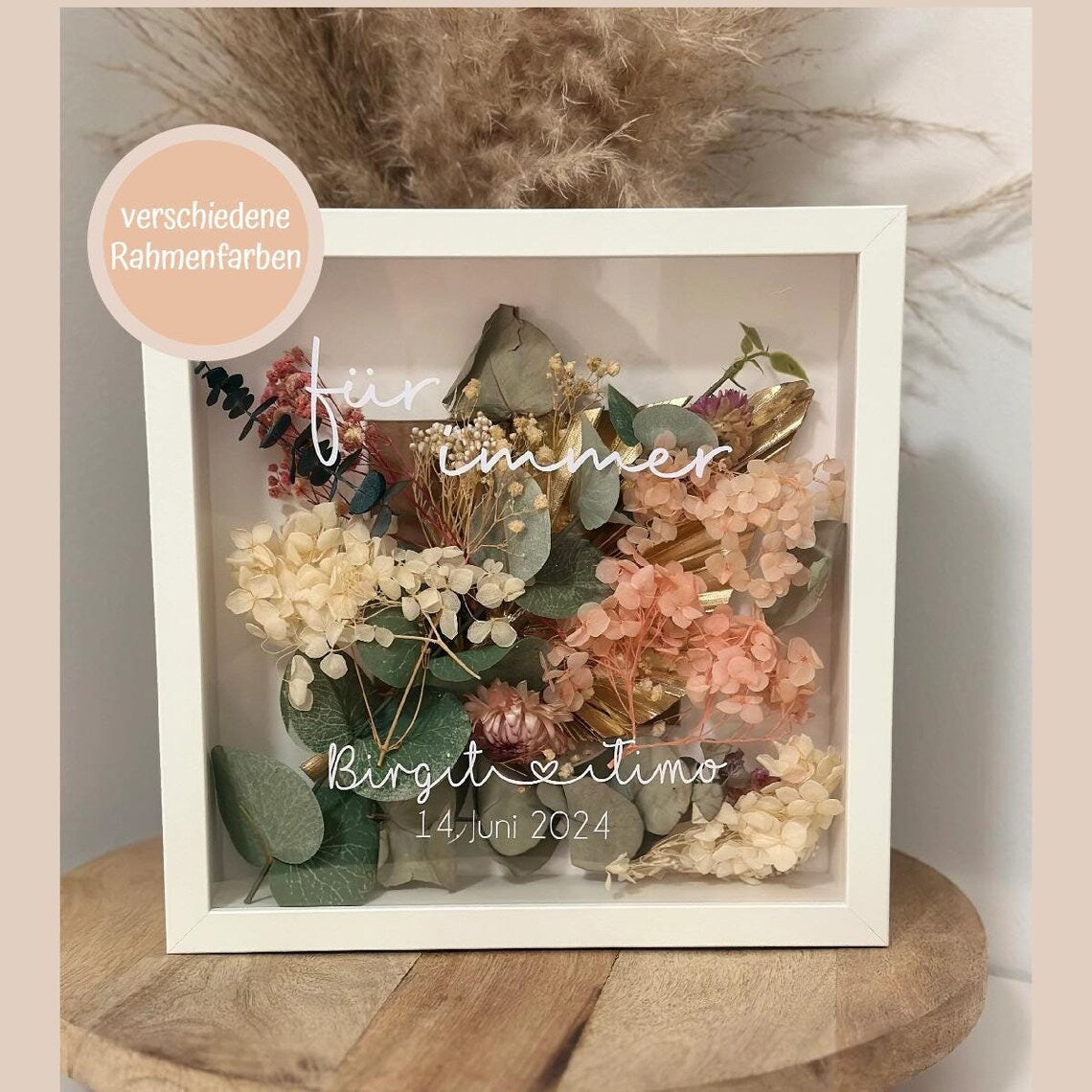 Hier findest du die perfekte Lösung: ein stilvoller, personalisierter Bilderrahmen, in dem dein Brautstrauß einen würdigen Platz bekommt – eine wunderschöne Erinnerung an euren großen Tag.